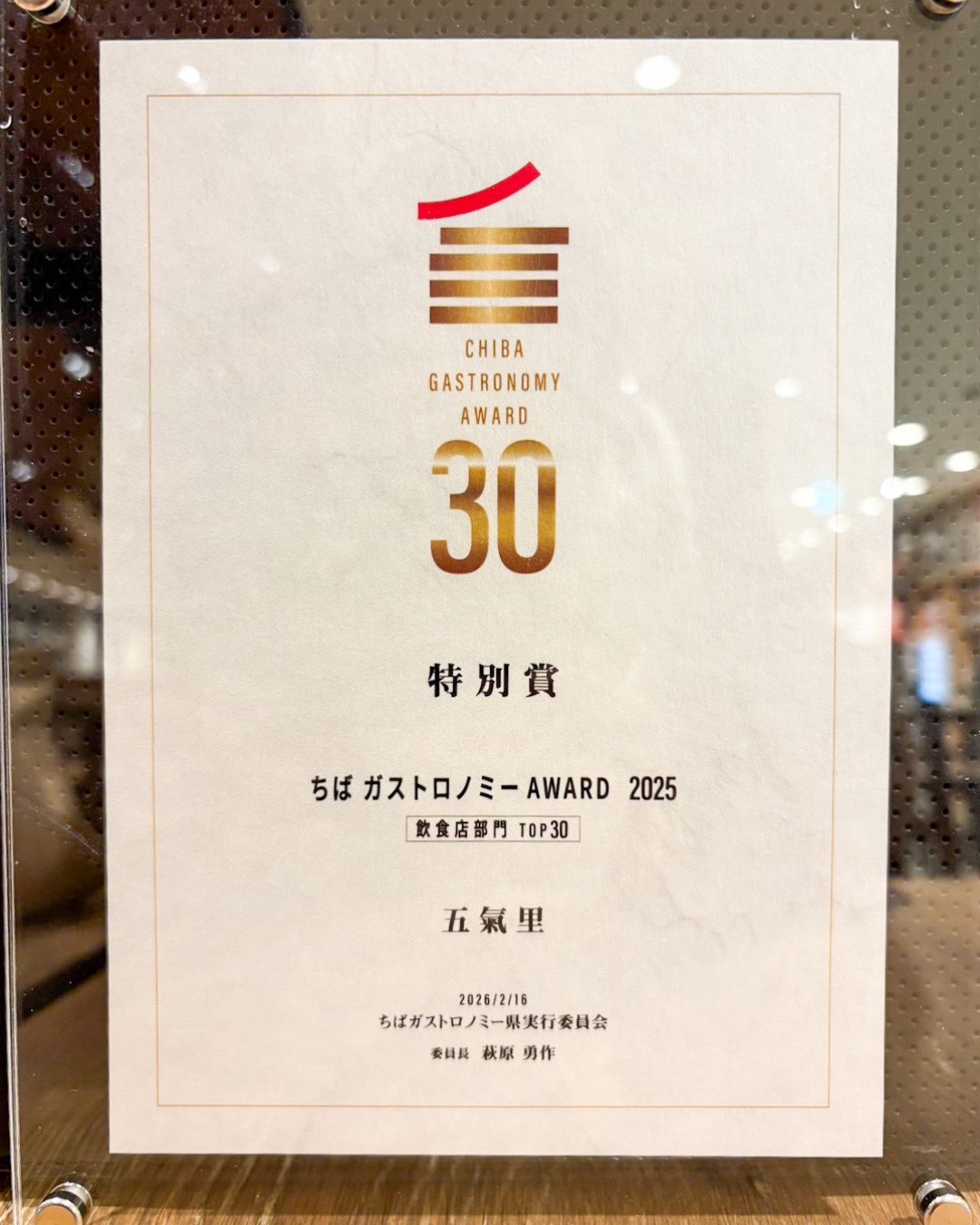 この度【ちば ガストロノミーAWARD 2025 飲食店部門 TOP30】に五氣里が選ばれました。その中でTOP6となる特別賞を受賞させていただきました。